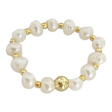 Handmade with elastic freshwater pearls and 18k gold-filled details, this ring exudes elegance and sophistication. Each pearl is strung together with care, creating a unique and eye-catching piece. Elevate any outfit with this versatile and timeless statement ring.