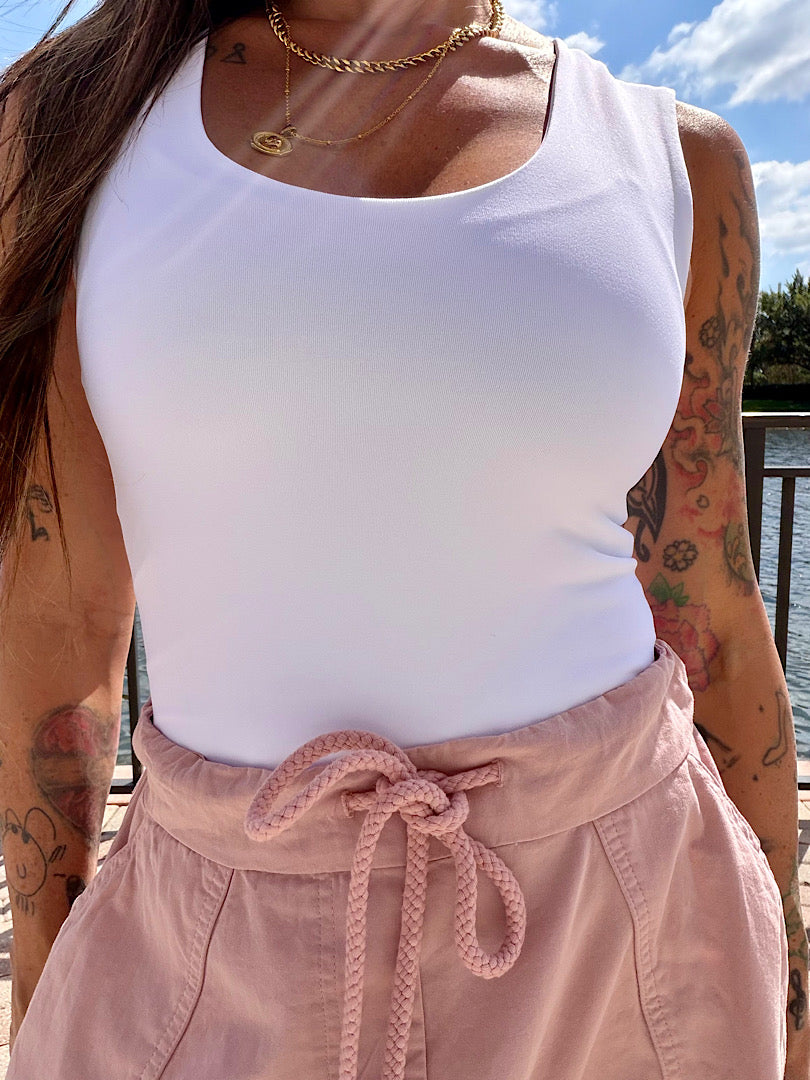 Clean, sculpted, and endlessly versatile — the Cloud Tank is the elevated essential your wardrobe has been waiting for. Designed in a soft knit spandex blend with a double-layered, seamless construction, this sleeveless top smooths and supports while feeling like a second skin. The sleek, body-contouring fit offers the perfect balance of stretch and structure, creating a flattering silhouette you can wear on its own or layered under your favorite pieces.