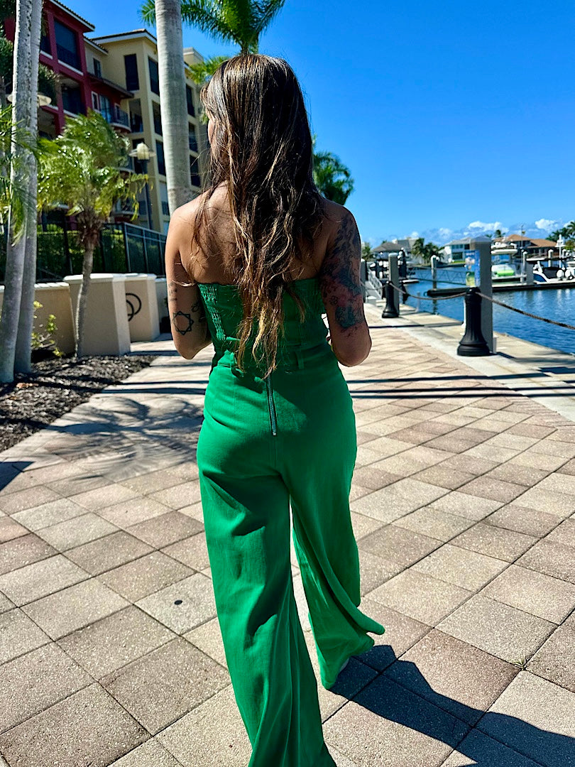 Turn heads in our Green Muse Jumpsuit, a bold mix of effortless cool and curve-flattering structure. Designed with a bustier-inspired, strapless neckline, this piece sculpts the bodice while providing comfort with its soft stretch denim. The wide-leg silhouette elongates the legs and moves with ease, making it the perfect choice for a casual day look or a night out with heels.