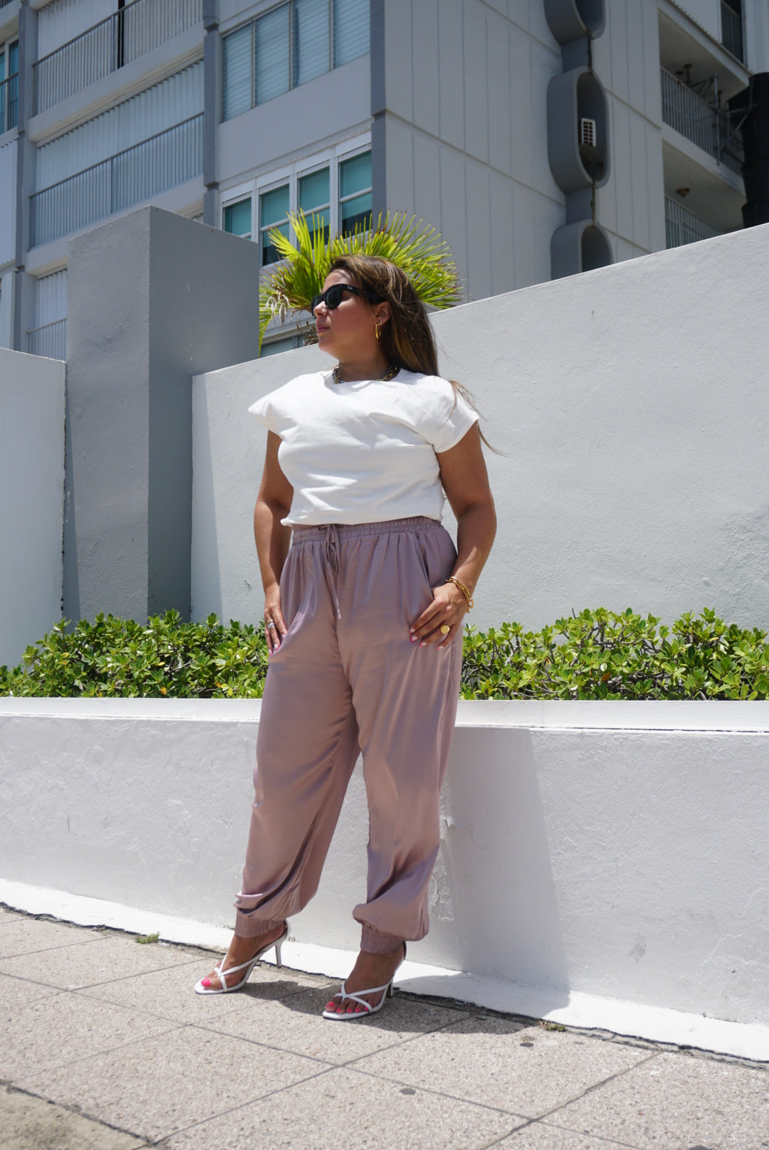 Satin jogger pants in mocha color with pockets and adjustable drawstring.